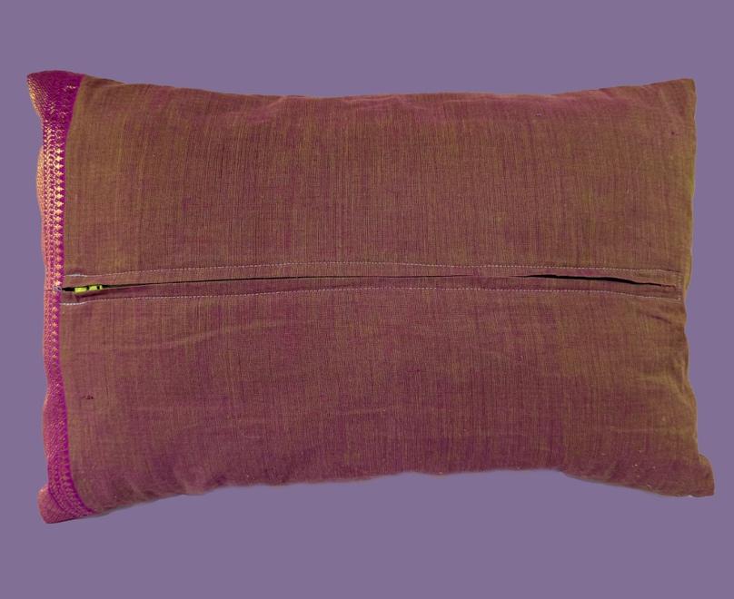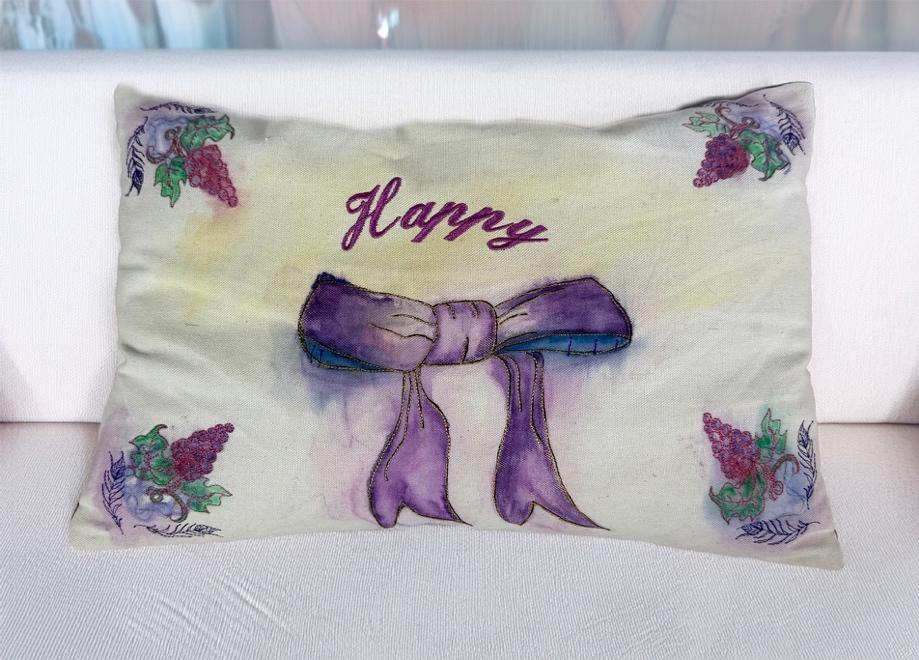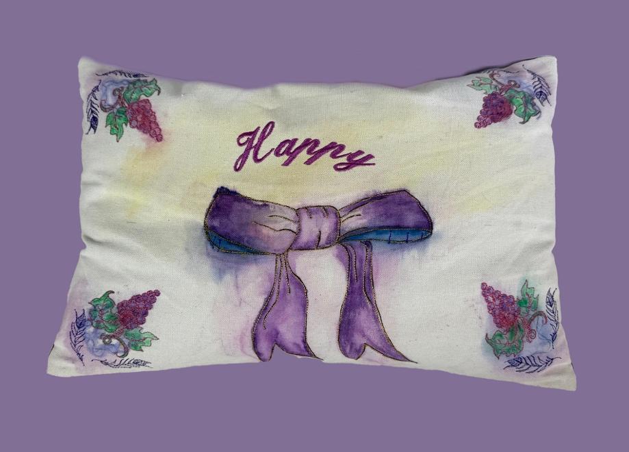 One of a kind lumbar pillow. Using Derwent permanent watercolor pencils, drawing and watercolor techniques created this design. Machine sewed embroidery, mimicking leaves, vines, and to emboss the ribbon enhances the design. To achieve sustainability, the pillow uses recycled shirts as stuffing, forgoing synthetic materials. A separate inside pillow makes it easy to separate and machine wash. The outer pillow back uses a repurposed Indian silk Sari so this fabric must be dry cleaned. The inner pillow is washable with other clothes.
